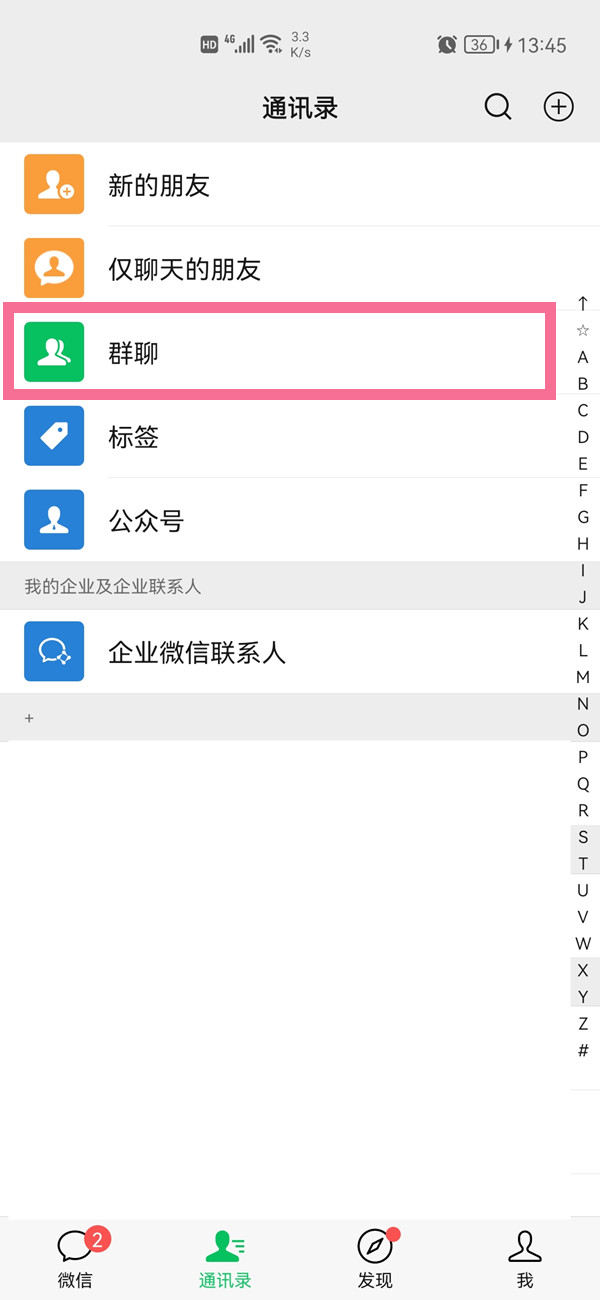 3、切换至“通讯录”界面,点击【群聊】即可找到加入的微信群。