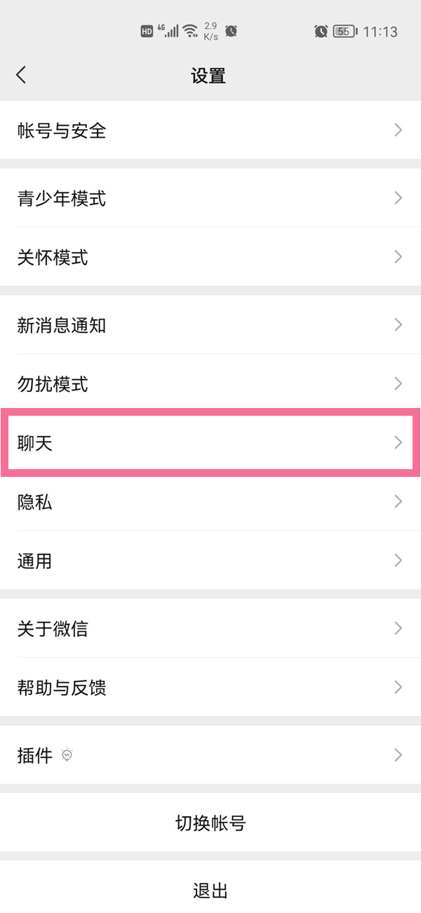 1、打开手机微信,在“我”界面点击设置,选择【聊天】。