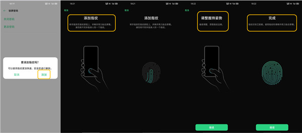 3、密码设置完成后会弹出【是否添加指纹】,点击添加可以按照提示一步一步添加指纹(后续可以通过输入密码或指纹来进行解锁)。
