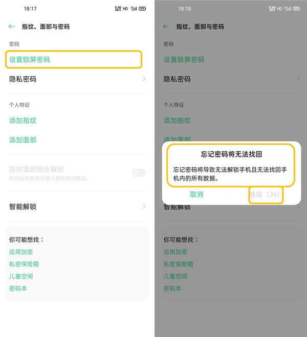 2、选择【设置锁屏密码】会弹出警示框--【忘记密码将无法找回】,等待倒计时结束点击继续,可直接输入锁屏密码或者选择其他加密方式,图案密码/4位数字密码/4-16位数字密码/4-16位字母数字密码(因涉及隐私无法截图)