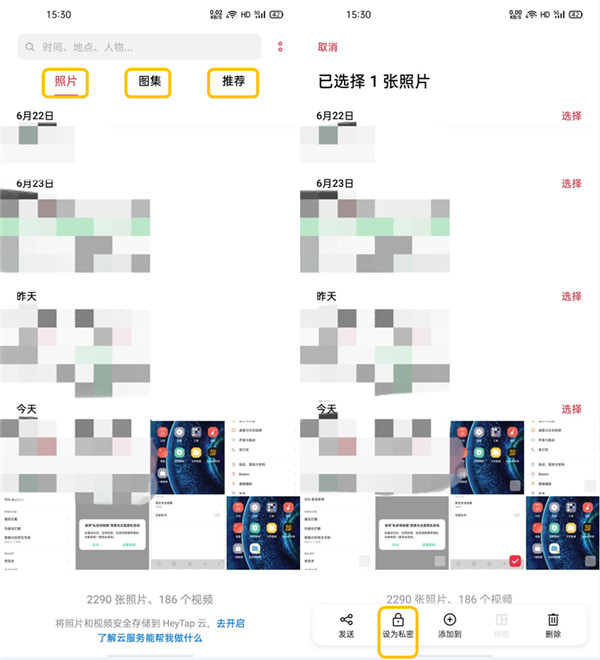 3、打开桌面【相册】长按屏幕上方【照片/图集/回忆】即可打开私密保险箱,长按相册内某张图片,点击屏幕下方【设为私密】照片就会添加到私密保险箱里。