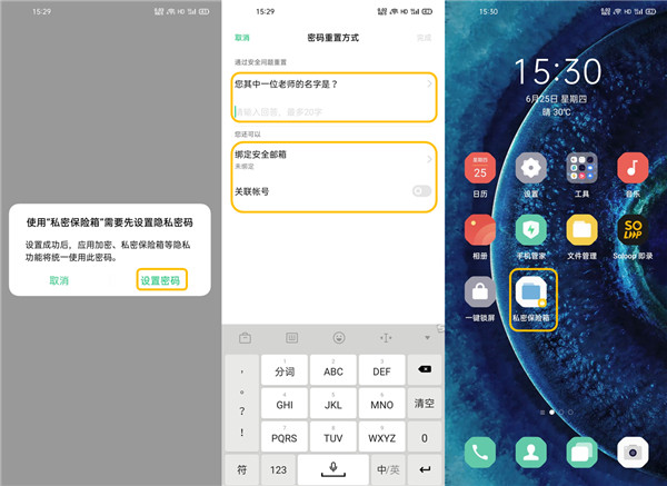 2、第一次进入私密保险箱需要【设置隐私密码】,(因涉及隐私无法截图)。密码设置完成后,再设置【安全问题】添加安全邮箱和关联OPPO帐号,忘记隐私密码时可通过安全问题/安全邮箱/OPPO帐号找回隐私密码,点击右上角【完成】。
