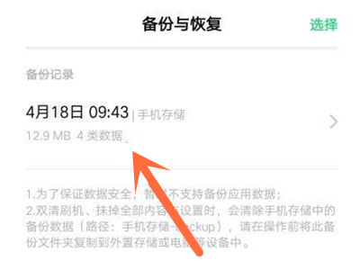 2、点击要恢复的备份记录,勾选需要恢复的数据类型,点击【开始恢复】即可。