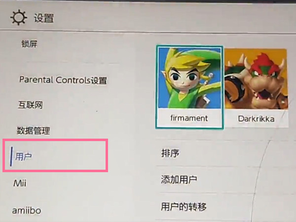 1、在switch的主界面中,点击右下角的设置选项,下拉点击【用户】选项。
