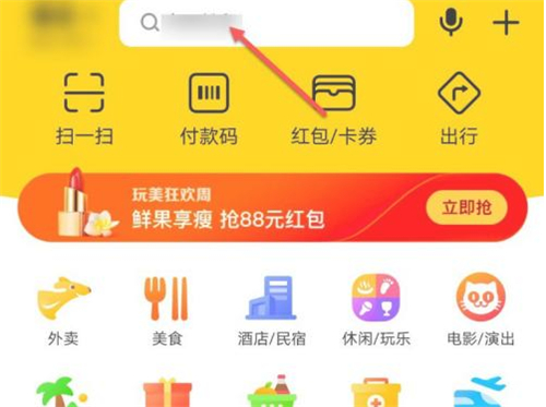 1、打开美团app,在首页界面点击上端搜索框。