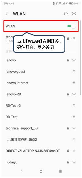 3、点击【WLAN】右侧开关,亮色开启,反之关闭。