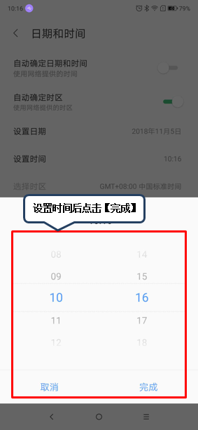 6、点击【设置时间】,然后进行时间设置,设置完成后点击【完成】。