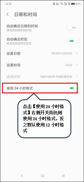7、点击【使用24小时格式】右侧开关亮色则使用24小时格式,反之默认使用12小时格式。