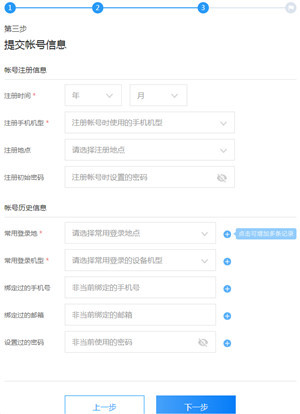 6.根据自己所记得的信息填入账号注册信息,红星号选项是必填选项,其他选项尽可能的详细填入,点击下一步。
