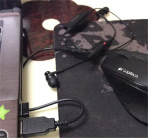 3.将附赠的 micro USB 连接线连接到ATH CKR55BT耳机充电接口,然后将另一端连接到已启动的电脑或者 USB 电源适配器连接到电源上。