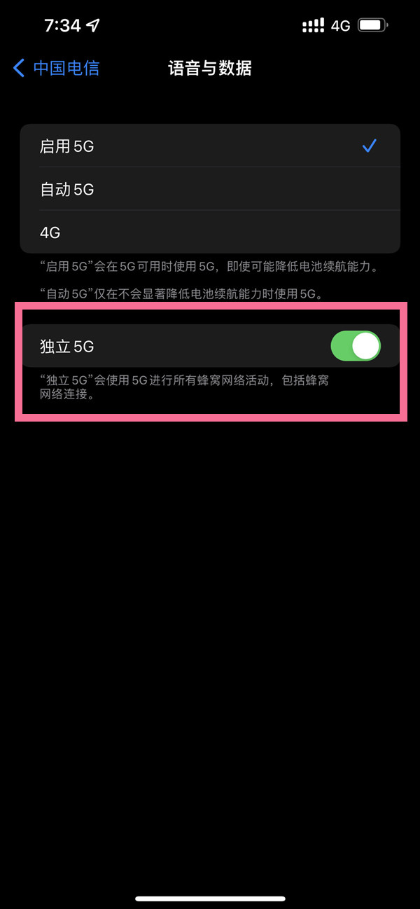 3、点击语音与数据,选择使用【独立5G】。