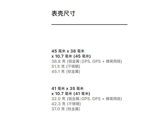 apple watch7有45毫米和41毫米尺寸的,45毫米的铝金属38.8克、不锈钢51.5克、钛金属45.1克;41 毫米的铝金属32.0克、不锈钢42.3克、钛金属37.0克。