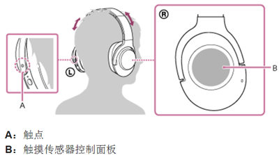 调节头带的长度,佩戴耳机时使指示在左耳,指示在右耳。耳机的左侧单元有一个触点,佩戴耳机时请小心,不要接触到触摸式传感器控制面板。