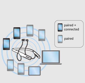 本耳机最多可保存8个蓝牙设备或智能手机的连接配置。如果将耳机与第9个蓝牙设备配对,则使用率最低的蓝牙设备连接配置将被覆盖。如果想要与被覆盖的蓝牙设备重新建立连接,须再次与耳机机进行配对。