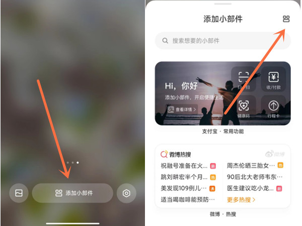 1、打开手机,桌面长按或双指捏合,点击【添加小部件】,再点击右上角的分类图标。