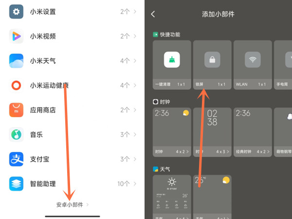 2、点击【安卓小部件】,再点击【锁屏】即可将其添加到桌面。