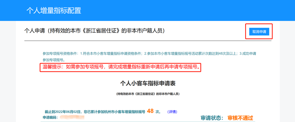 4、没有“专项摇号”按钮的,请根据温馨提示先重新申请。可在重新申请过程中选中参加专项摇号,也可在完成重新申请后点击“专项摇号”按钮。