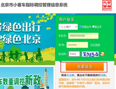 第一步:打开北京市小客车指标调控管理信息系统,输入手机号、密码后,点击【我要登录】
