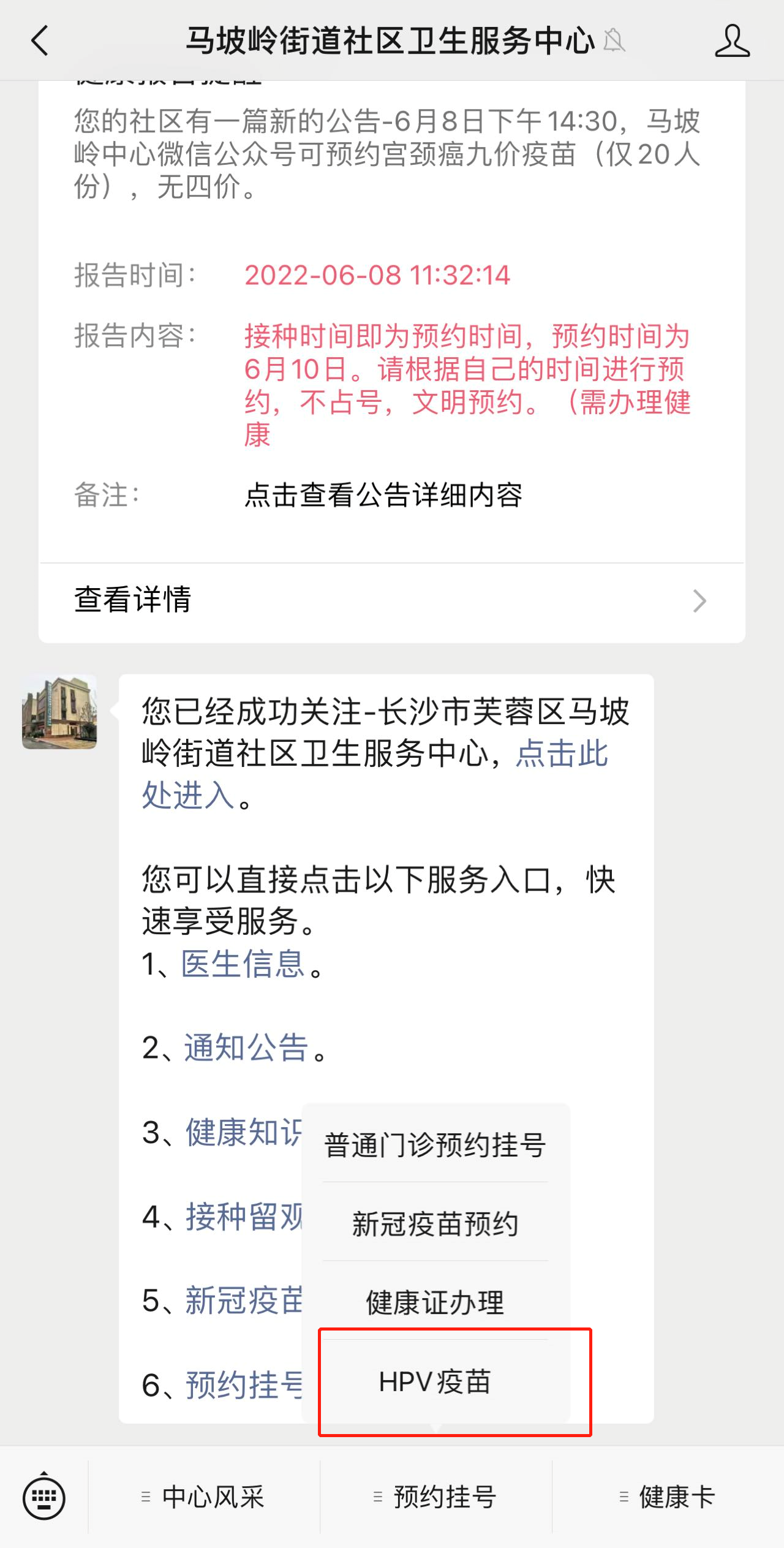 6月8日,芙蓉区马坡岭街道社区卫生服务中心有九价hpv疫苗可以预约,详细预约信息如下。