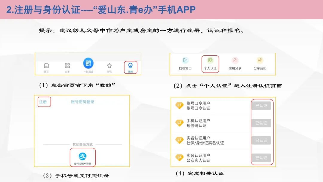2022年城阳区局属公办幼儿园招生实施“一网通办”,报名家长通过本人手机下载安装“爱山东”或“爱山东·青e办”APP,提前进行注册和身份认证,并在报名批次规定时间内进行网上信息采集、材料上传。