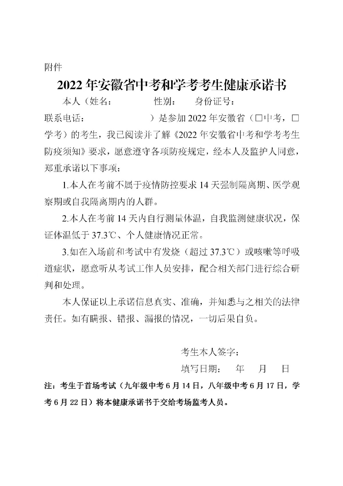 从考前14天(中考前期已做布置,再次强调九年级中考从5月31日,八年级中考从6月3日;学考从6月8日)起,所有考生须做好个人健康状况监测,每日测量体温并记录,如实完整填写《2022年安徽省中考和学考考生健康承诺书》(简称《考生健康承诺书》,见附件)。考生如出现发热、咳嗽、乏力、鼻塞、流涕、咽痛、腹泻等症状,要及时就医诊疗。