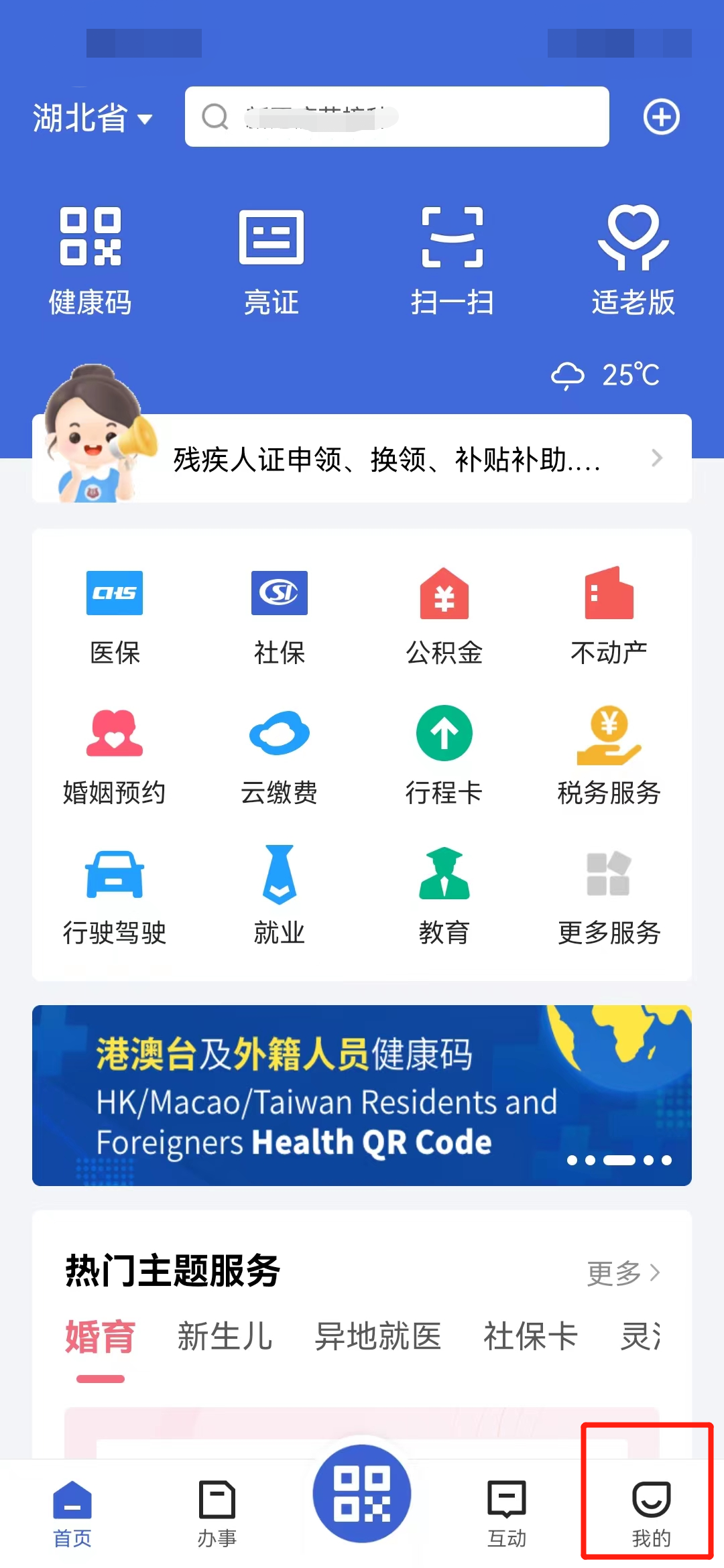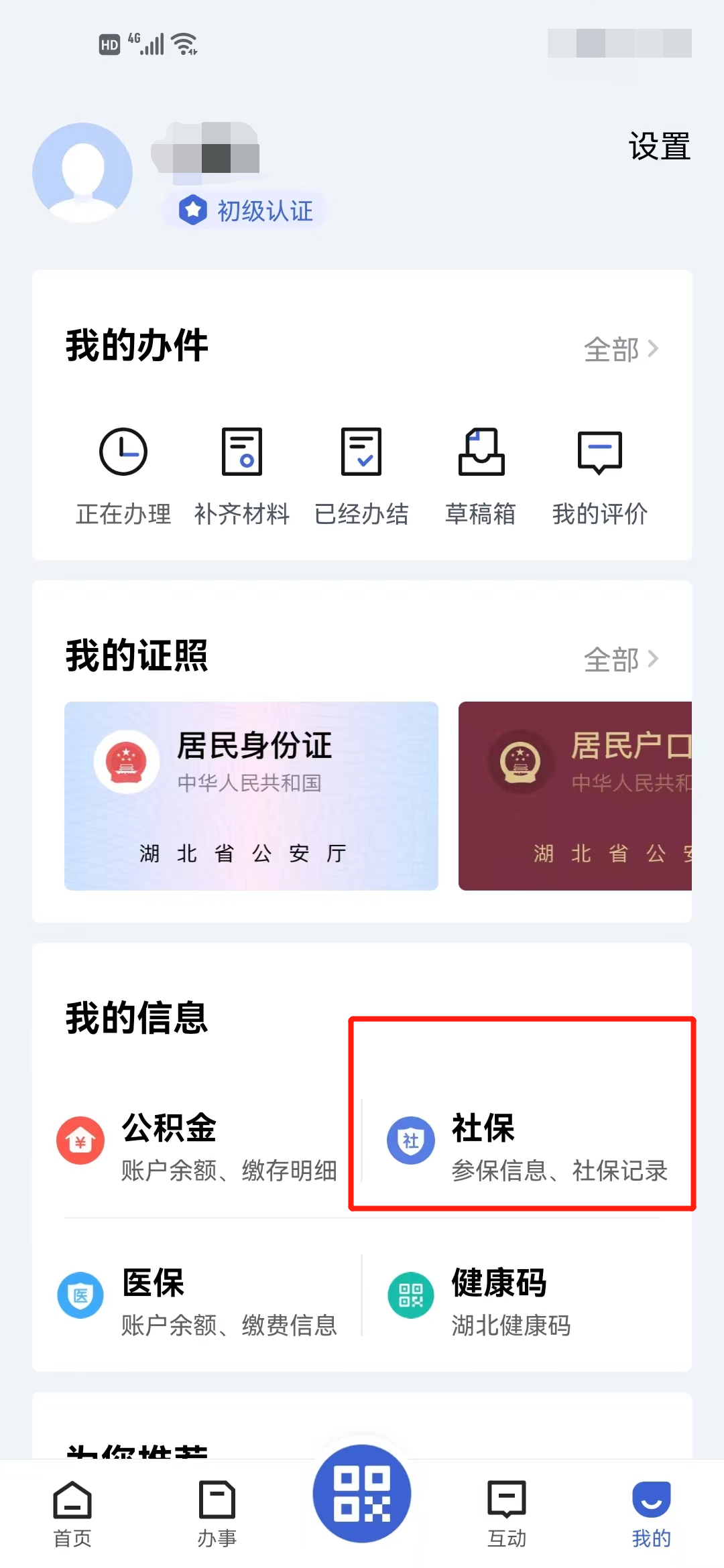 1、打开“鄂汇办”APP,找到右下角“我的”,在“我的信息”中选择“社保”。