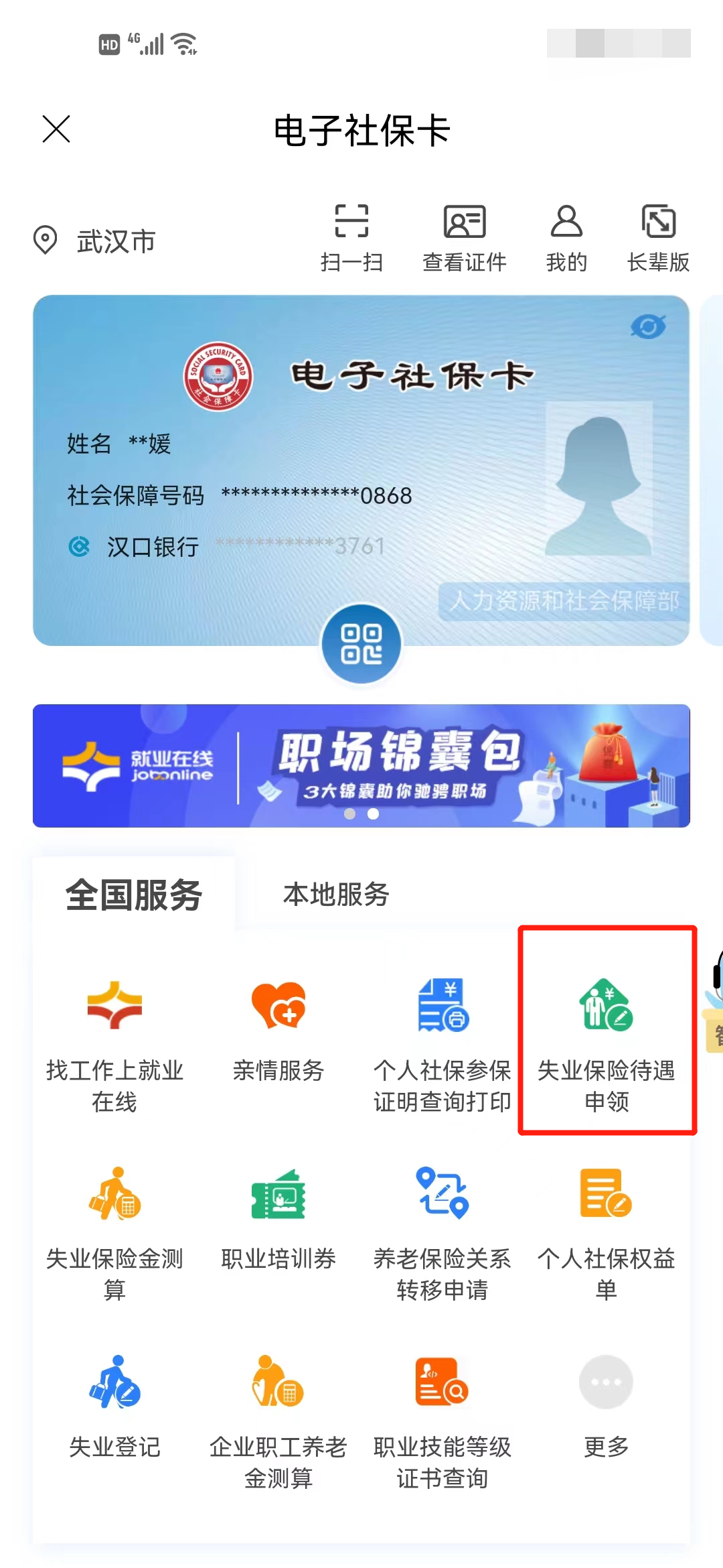 2、点击“我的电子社保卡”,在“全国服务”中选择“失业保险待遇申请”业务。