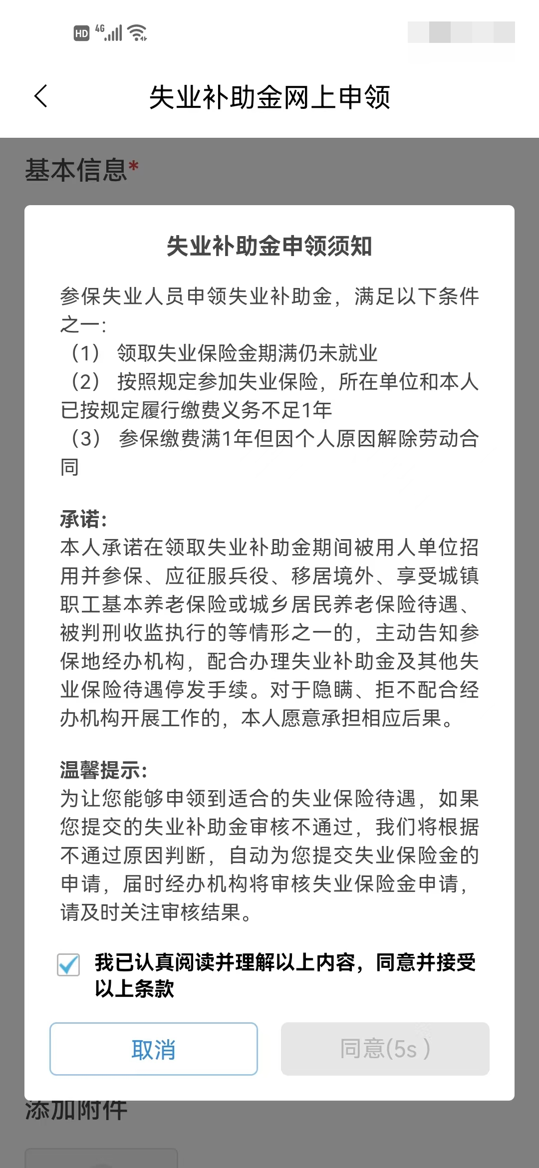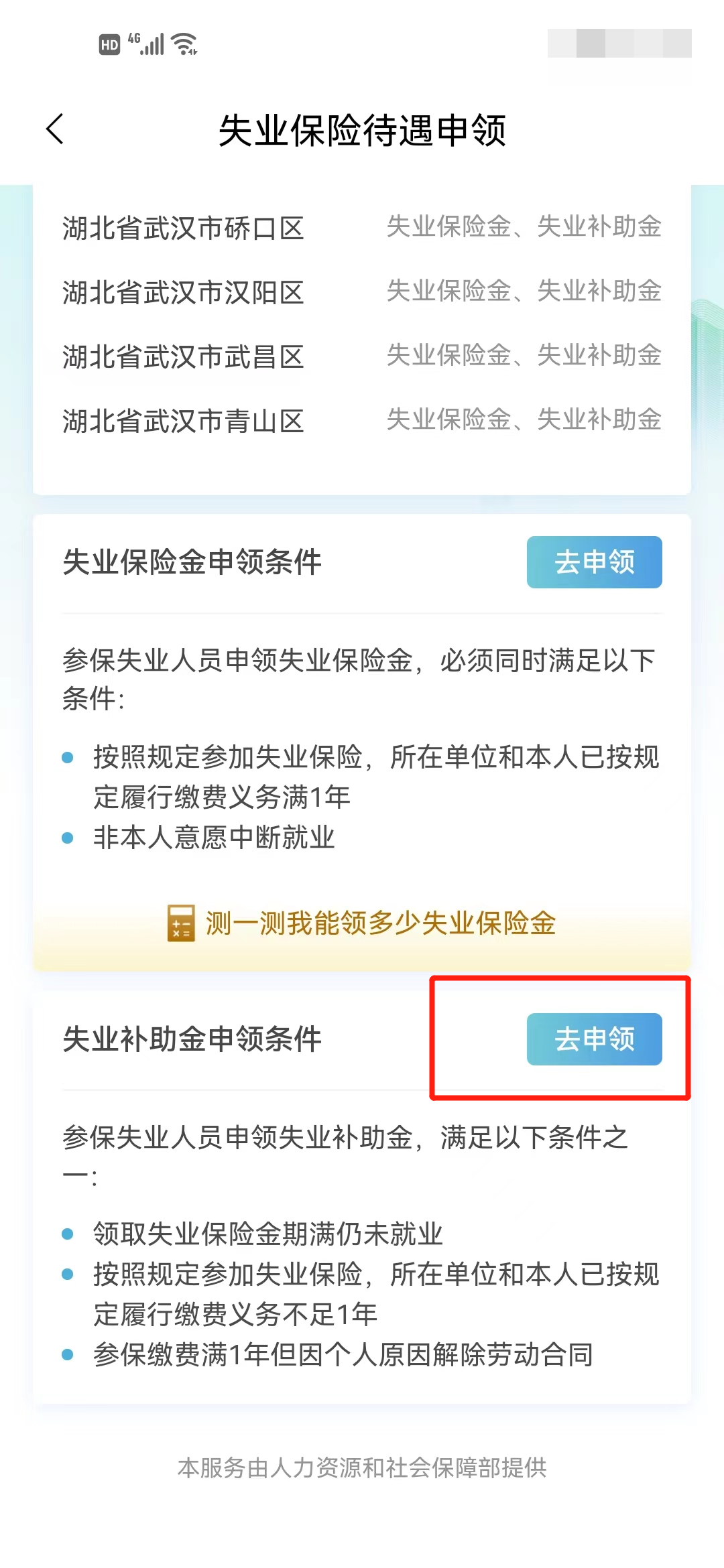 3、向下滑动页面找到“失业补助金申领条件”,点击版块右侧的“去申领”按钮,仔细阅读“失业补助金申领须知”,选择“同意”之后会弹窗提醒,确认待遇发放银行卡账户。