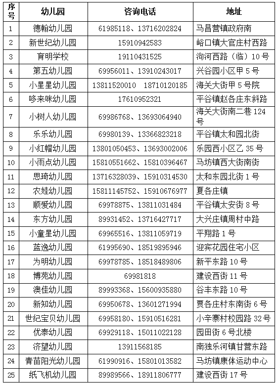附件:平谷区幼儿园招生咨询电话