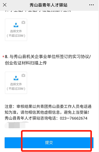 2. 关注“重庆秀山共青团”微信公众号,点击菜单栏“青年服务—青年人才驿站”,进入申请页面提交相关资料,下滑点击提交,经秀山团县委审核通过后即可入住驿站。