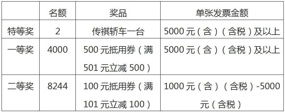 具体如下:单张发票金额5000元(含)(含税)及以上设置可参与抽取特等奖和一等奖,特等奖2名,各奖励价值87800元广汽传祺轿车一台,奖品价值总计17.56万元;一等奖4000名,各奖励价值500元抵用券一张(消费券有效期为7天,满501直接立减500元,下同),奖品价值总计200万元。