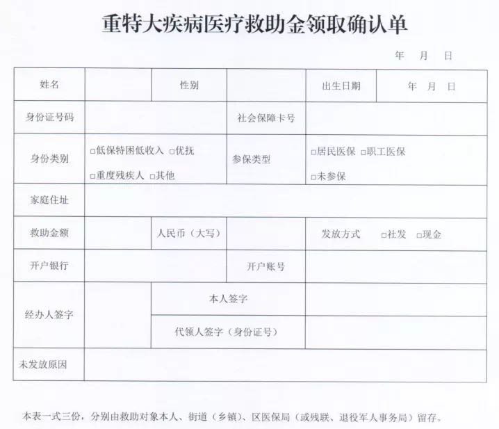 救助对象收到救助款项后,需填写《重特大疾病医疗救助金领取确认单》(一式三份),由救助对象本人、区有关部门(指区医保局、区退役军人事务局或区残联)、街道 《 乡镇)各留存一份。