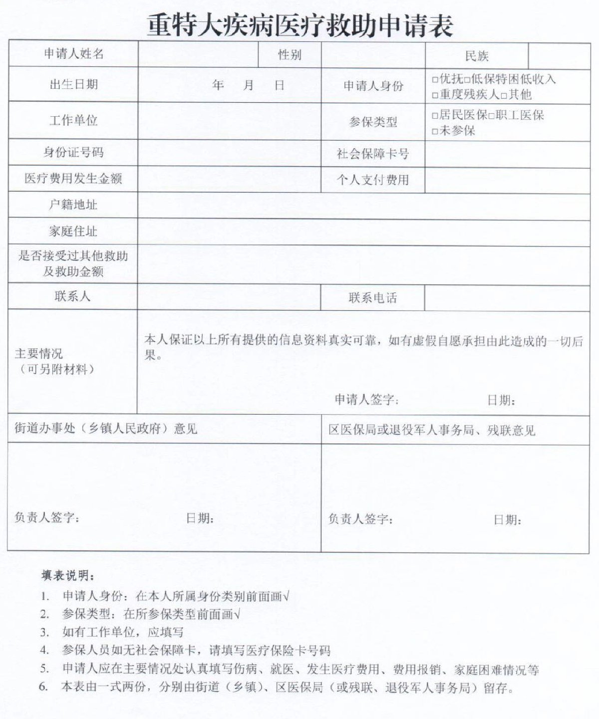 街道(乡镇)组织救助对象填写《重特大疾病医疗救助申请表》(一式三份),提出初审意见,并按照人员类别和职责分工分别报区医保局、区退役军人事务局、区残联。