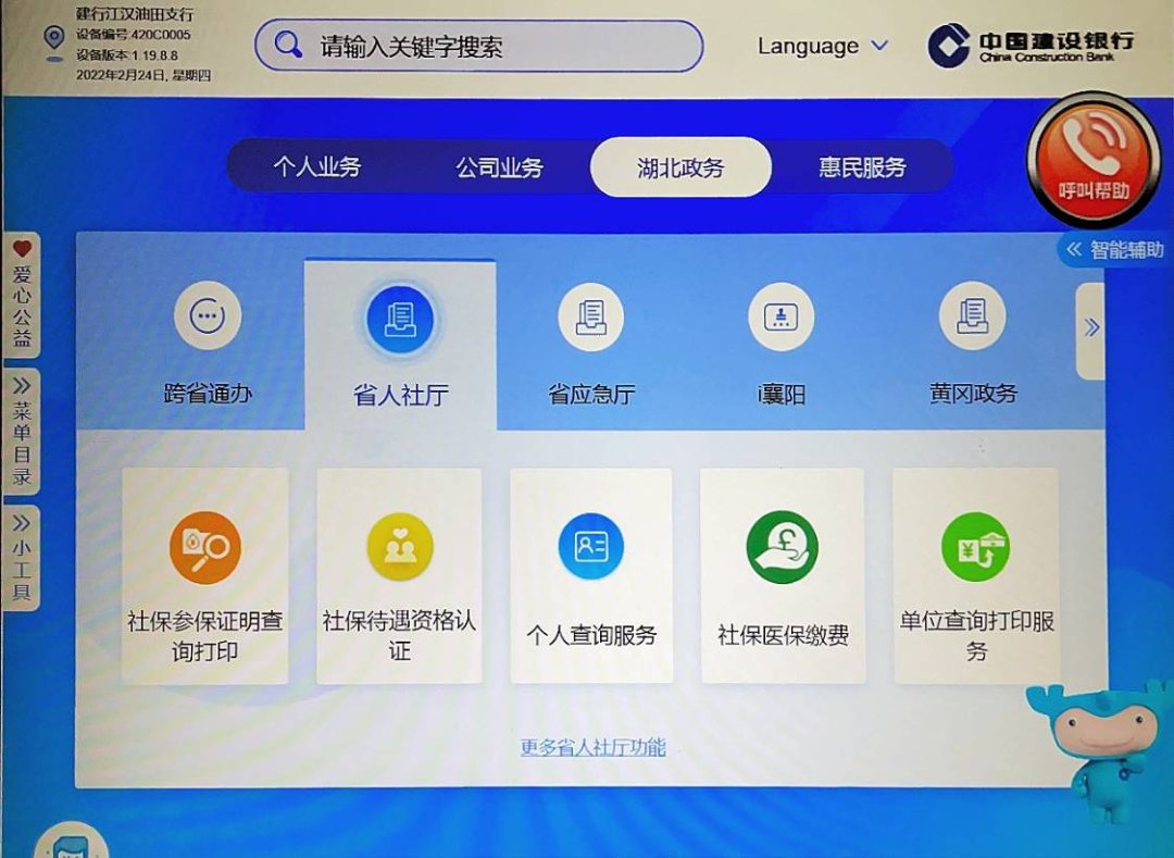 1、第一步:进入建行智慧柜员机“湖北政务”,选取“省人社厅”,进入“社保参保证明查询打印”功能。