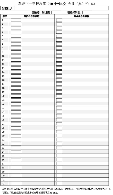 适用于本科提前批B段(艺术统考、艺术校际联考、体育类)、专科提前批(艺术统考、艺术校际联考、体育类)的平行志愿草表如下: