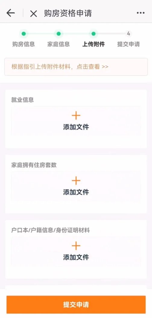 系统根据已填写的购房信息、家庭信息,提示申请人上传户籍信息、婚姻信息等证明材料。请申请人根据指引上传相关附件材料。