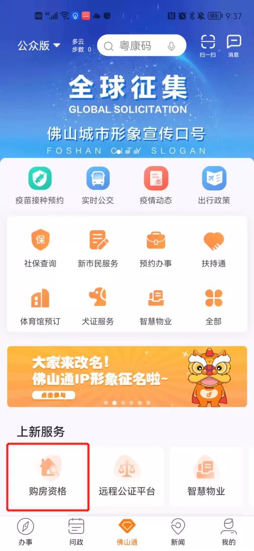 第一步:登陆佛山通,点击“购房资格”