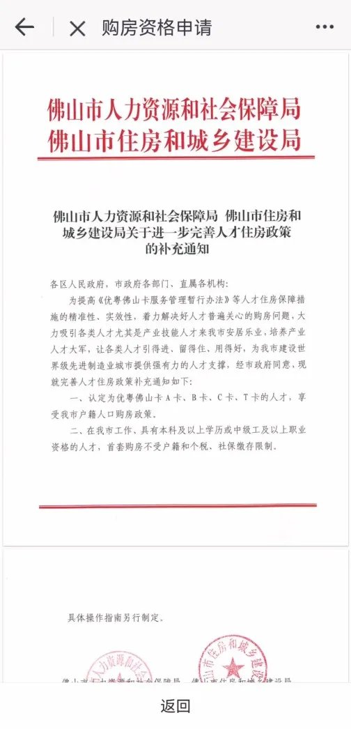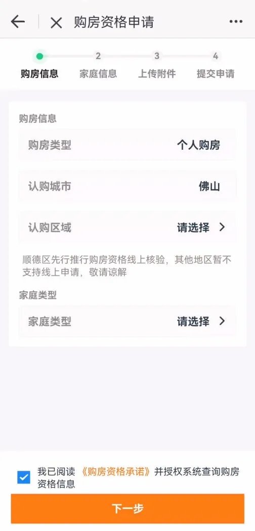 佛山于10月11日在顺德区先行开展购房资格线上核验工作。购房资格线上核验具备实名认证、材料在线递交、购房资格审查等多个功能模块,购房人只需使用手机,动动手指填写基础信息,并根据系统指引上传附件信息,系统将于1-5个工作日通过短信和佛山通App反馈审核结果。购房资格核验结果将与网签系统有效衔接,实现“信息多跑路,群众少跑腿”。