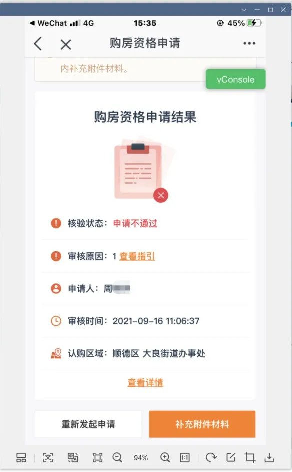 ①初步审核申请不通过的,申请人可点击“查看详情”,根据指引在3个自然日内补充附件材料(注意:每次购房资格线上核验仅有1次申请补充附件材料的机会)。