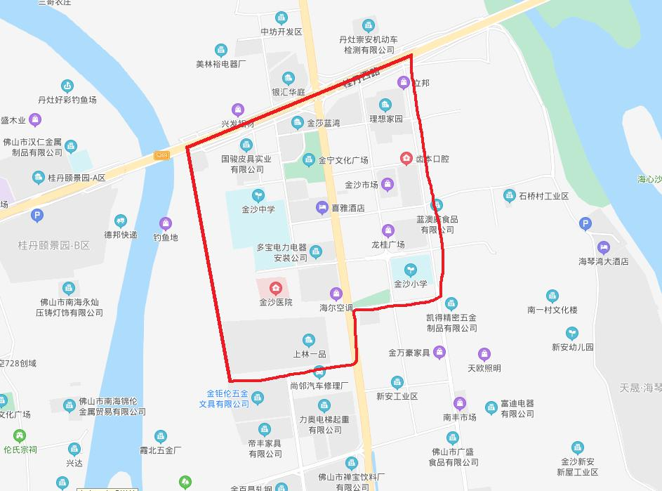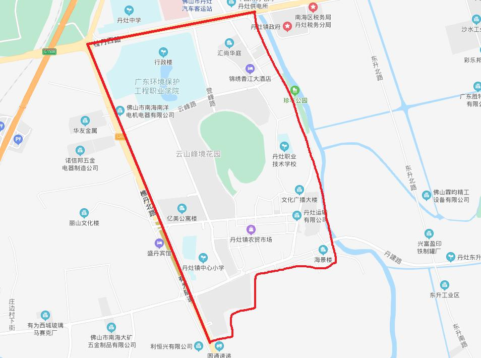 丹灶社区:东至丹灶大道官山涌,南至海安路及工业大道(包括碧桂园),西至樵丹路,北至桂丹路;