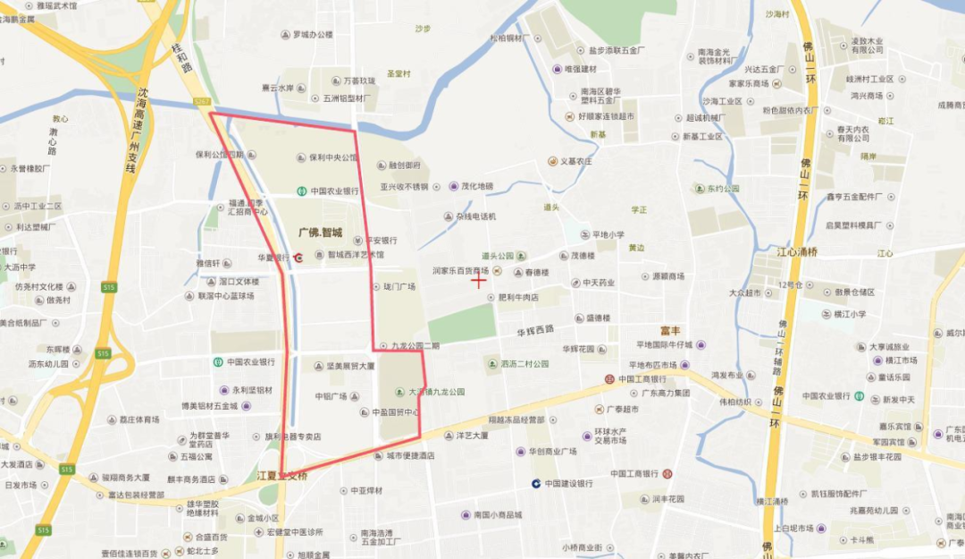 (一)北至广佛路—东至金贸大道—钟边路—南至沥兴花苑一巷西—西至竹基南路;