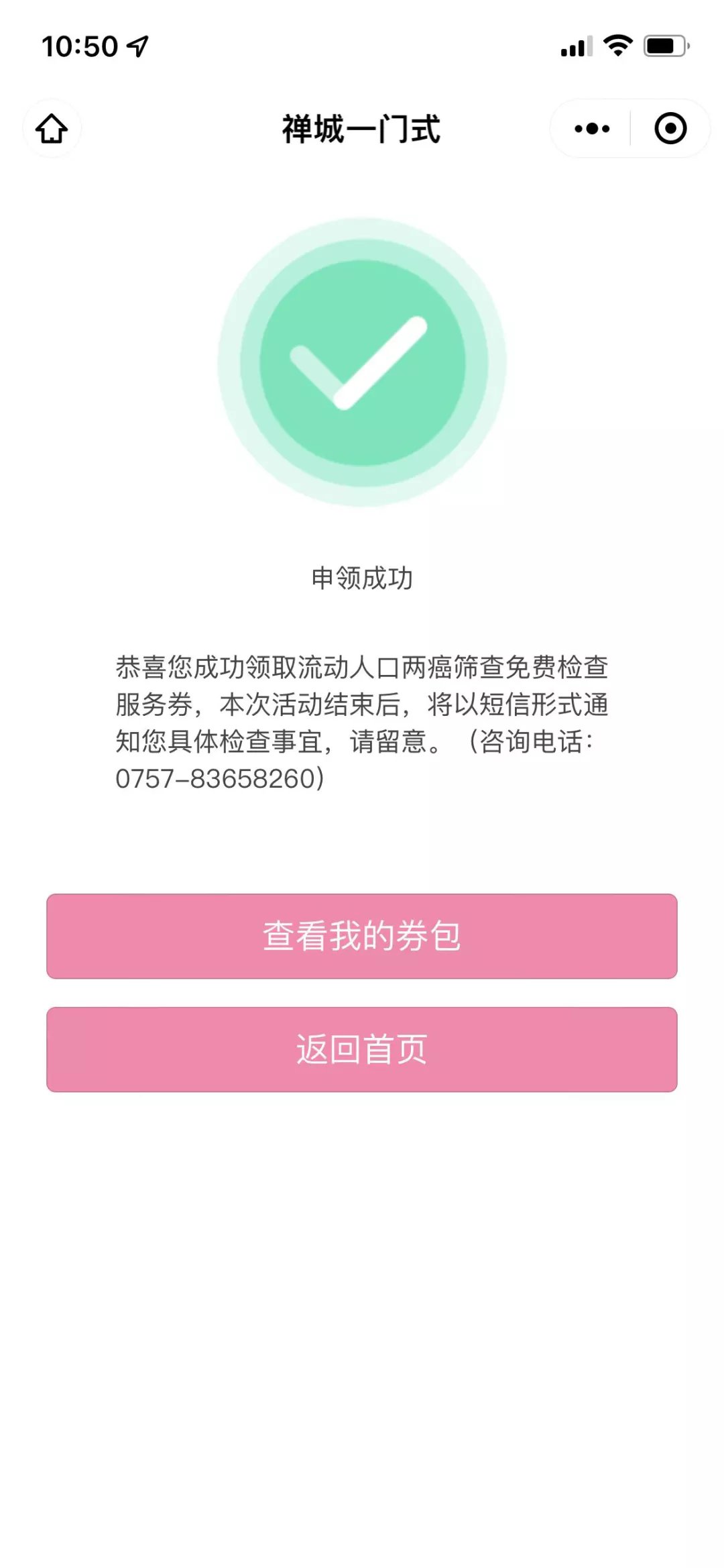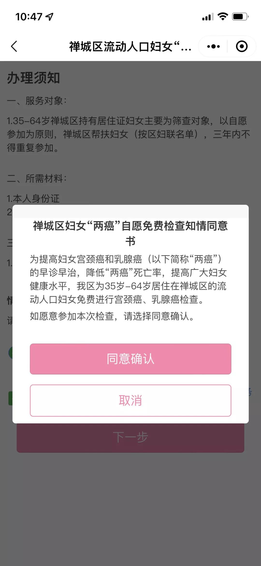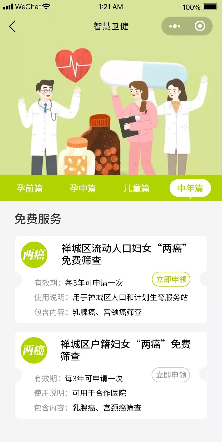 持禅城区居住证、非佛山市户籍的35-64岁流动人口妇女,可通过手机微信登录“禅城一门式”小程序进行申领,申领成功后凭电子券(条形码)前往禅城区人口和计划生育服务站免费检查。