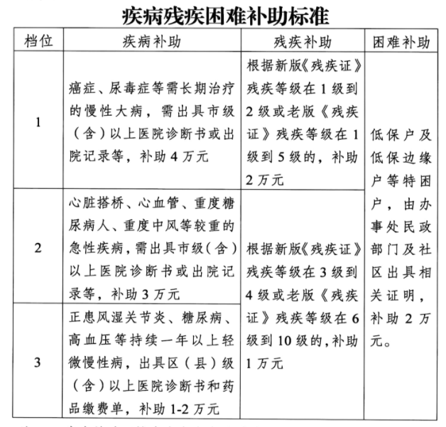 因征收搬迁给疾病户、残疾户、低保户及低保边缘户等群体造成诸多不便,被征收人、直管公房承租人、配偶以及户籍在南京市范围内的双方直系亲属符合规定情况的,给予一次性补助;每户疾病补助、残疾补助、困难补助,累计原则上不超过10万元。具体如下图所示: