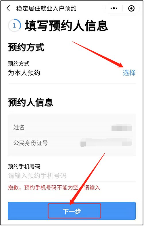 4、填写预约方式、预约人信息,点击【下一步】