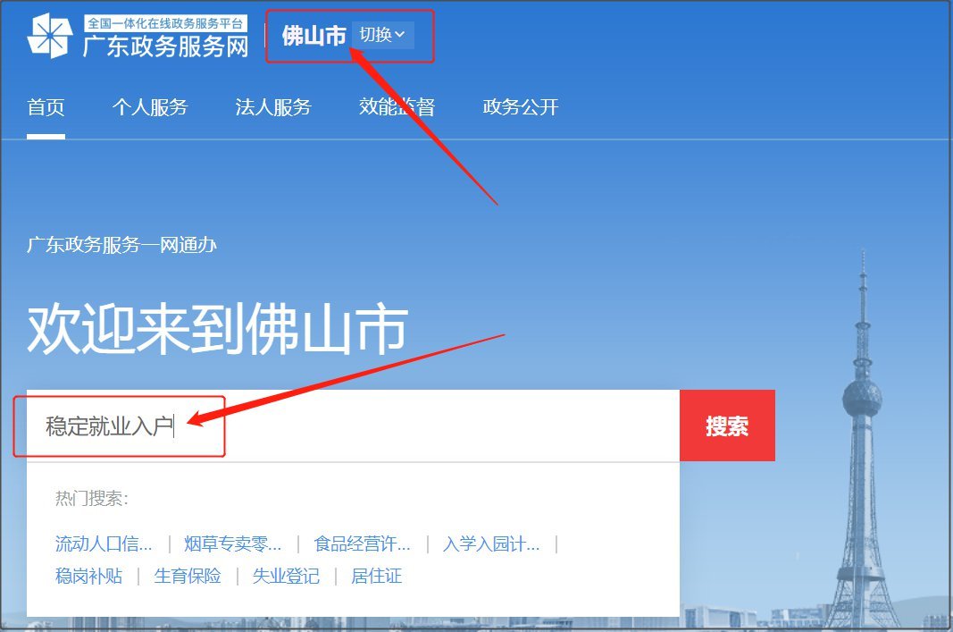 如:进入广东政务服务网,属地选择“佛山市”,在搜索框里直接搜索“稳定居住就业入户”。