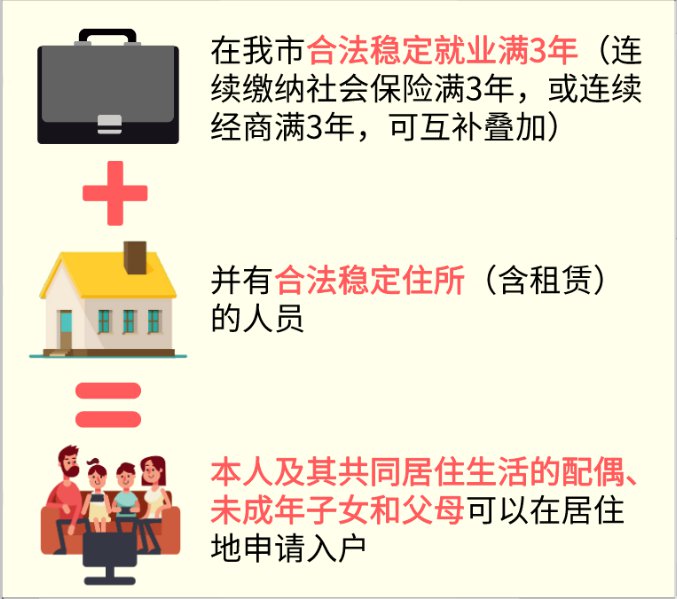 在佛山市合法稳定就业满3年(连续缴纳社会保险满3年,或连续经商满3年,可互补叠加)并有合法稳定住所(含租赁)的人员,本人及其共同居住生活的配偶、未成年子女和父母可以在居住地申请入户。