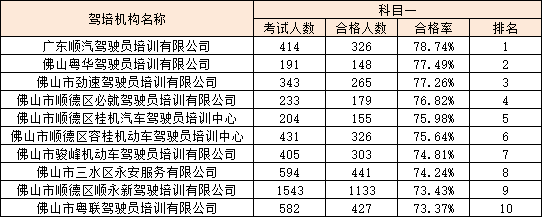 科目三合格率前十名: