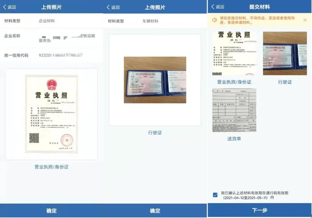 按要求上传通行码所需材料的影像资料,材料上传完毕后,勾选【我已确认上述材料有效期在通行码有效期内】,点击【下一步】。