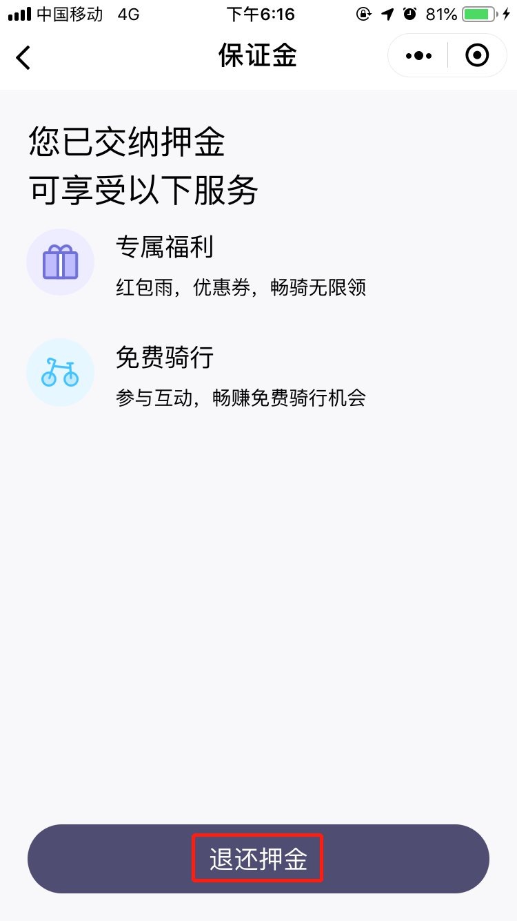 点击首页“钱包”→“我的钱包”→“押金”→“退回押金”,选择退押金的原因,再点击确定并退押金。