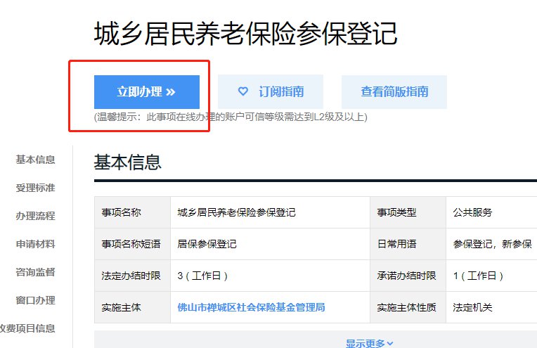 申请:申请人登录广东省政务服务网(https://www.gdzwfw.gov.cn/),选择需办理的事项后,点击“立即办理”,选择“个人参保登记”—“居民养老参保登记”;